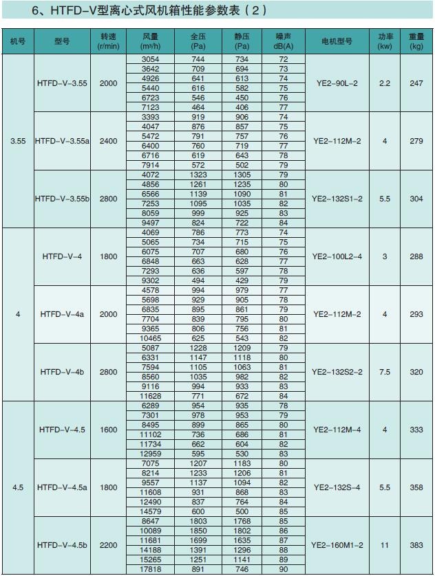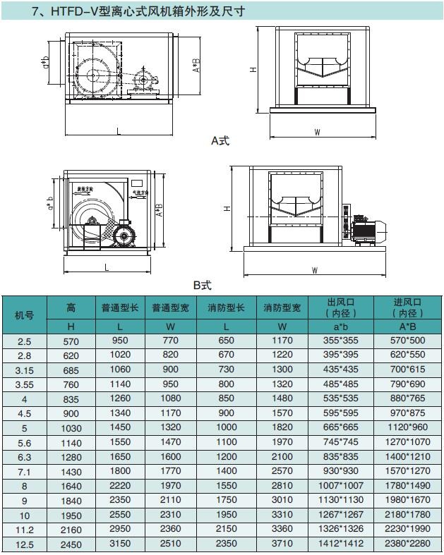 1.1.HTFD-Ⅴ型離心式風機箱是-種葉片為后傾式箱形離心風機,產品由低噪聲后傾葉片式離心風機、電機、軸承、傳動件、消聲型箱體等組成。根據安裝位置的不同,提供12種不同角度的進出風口位置,以滿足用戶不同安裝環境需要。根據消防與通風的要求不同分A型和B型兩種類型,B型電機裝在箱體外用于消防排煙,并經國家消防裝備監督質量檢驗中心按GA211-2009《消防排煙風機耐高溫試驗方法》進行耐高溫試驗,能在280℃高溫條件下連續運行60分鐘以上;A型電機裝在箱體內,用于通風換氣。