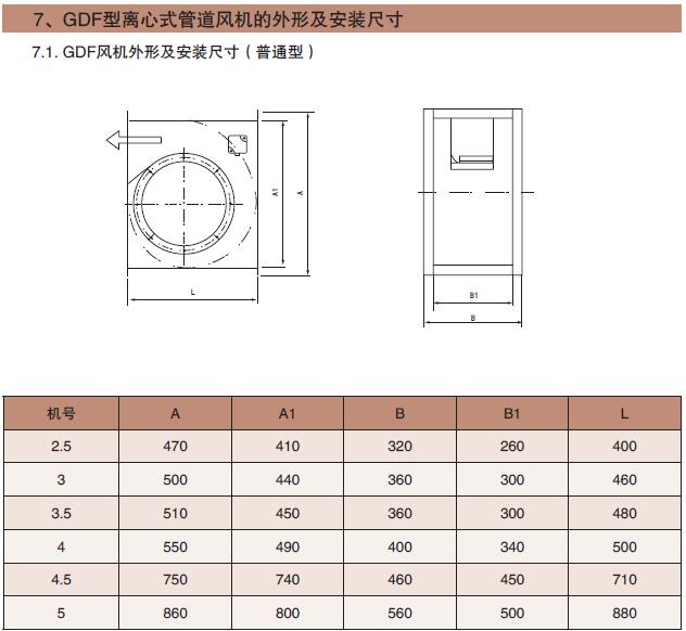 1.1.GDF型離心式管道風機,葉輪為前傾式多翼離心葉輪,單面吸風,風機設計成水平進出,